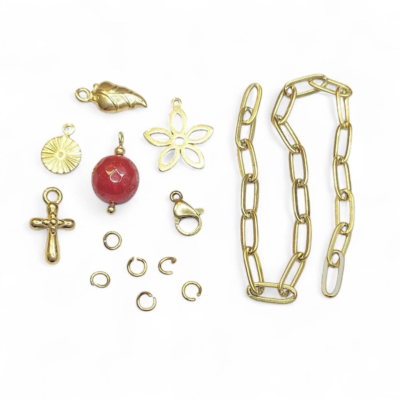 Denne box indeholder et fuldt kit af lækre smykkematerialer til at lave et armbånd. Forgyldt og vandfast.