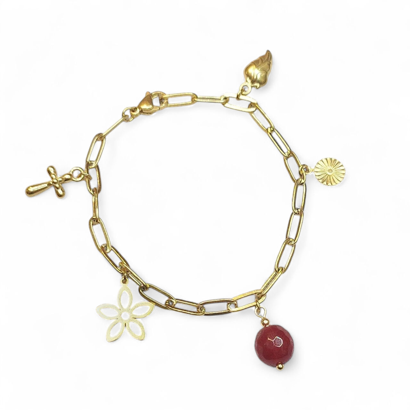 Kæde, lås, jump ringe og forskellige charms, hvoraf den ene er en mørkerød jadestensperle.