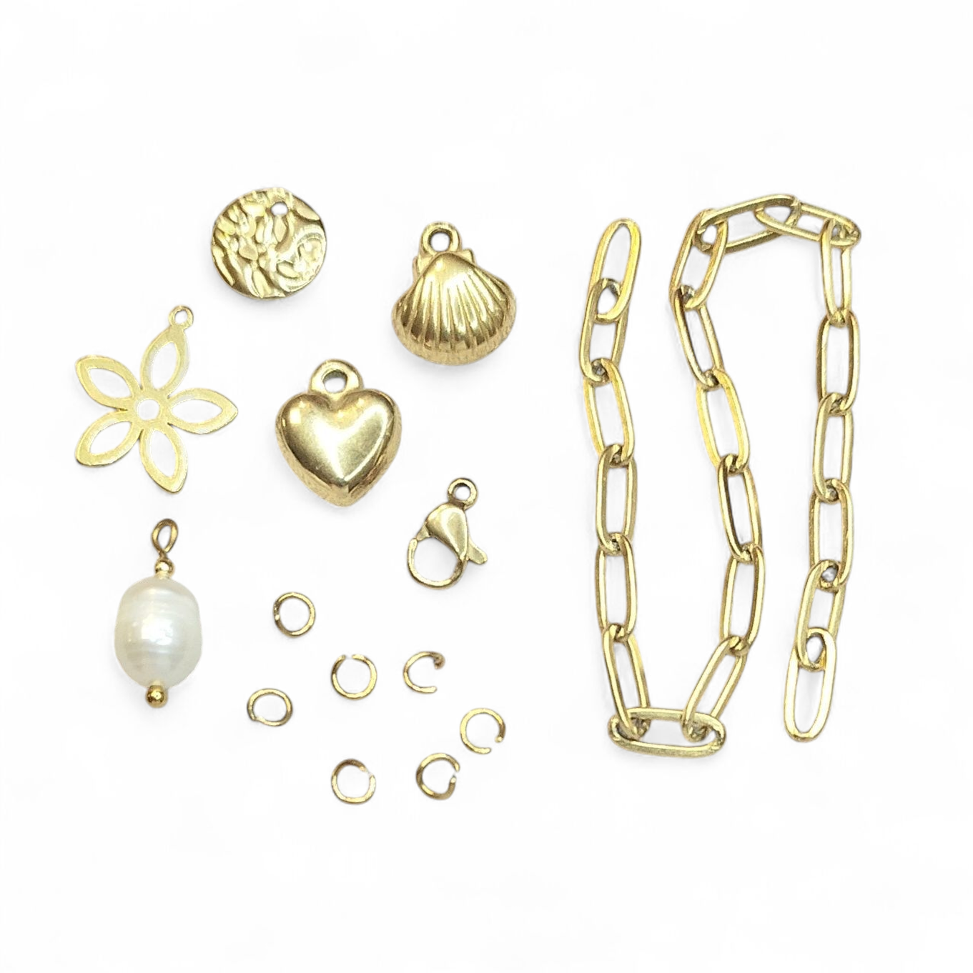 Denne box indeholder et fuldt kit af lækre smykkematerialer til at lave et armbånd. Forgyldt og vandfast.