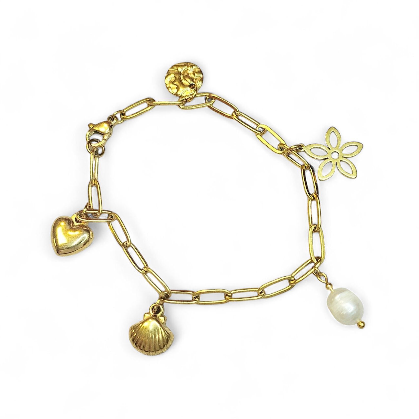 Kæde, lås, jump ringe og forskellige charms, hvoraf den ene er en ferskvandsperle.