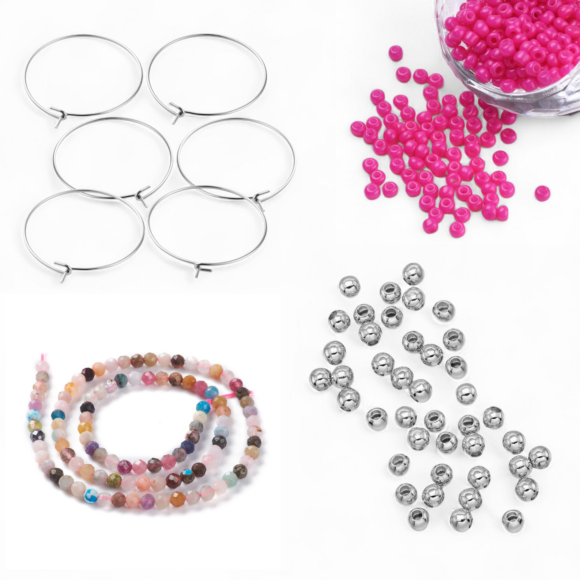 DIY pakke til 3 par hoops øreringe 20 mm. i stål, hot seed beads 3 mm., perler belagte med ægte platin, hel streng med mix af halvædelsten facetter 3-4 mm.