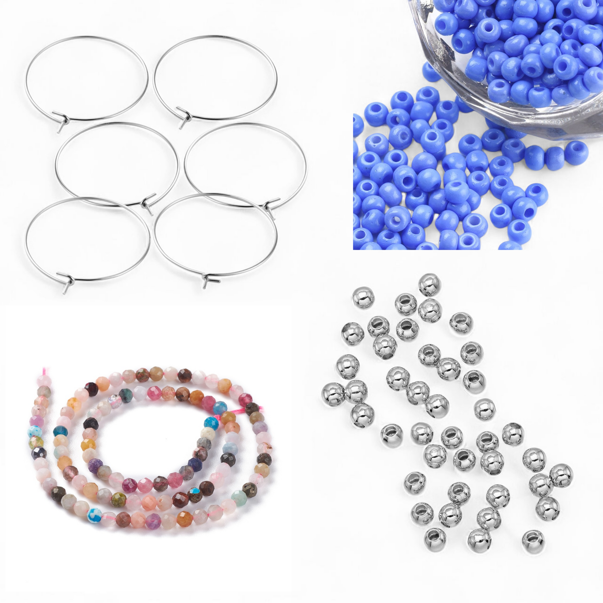 DIY pakke til 3 par hoops øreringe 20 mm. i stål, kornblå seed beads 3 mm., perler belagte med ægte platin, hel streng med mix af halvædelsten facetter 3-4 mm.