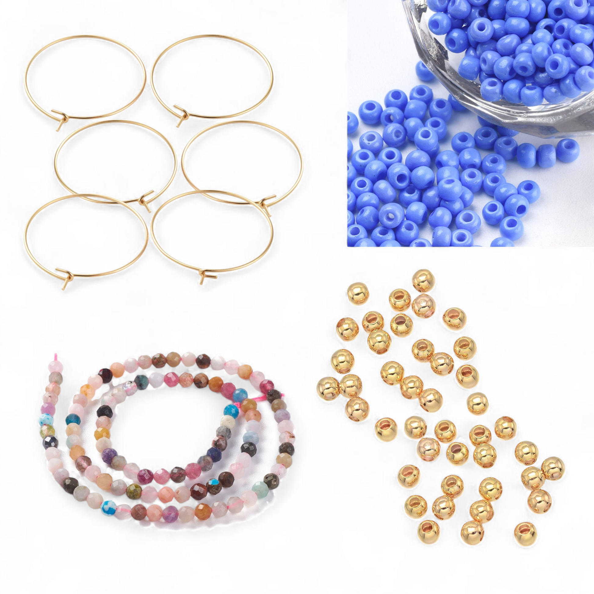 DIY pakke til 3 par hoops øreringe 20 mm. i stål forgyldt med 18k guld, kornblå seed beads 3 mm., perler forgyldte med 18k guld, hel streng med mix af halvædelsten facetter 3-4 mm.
